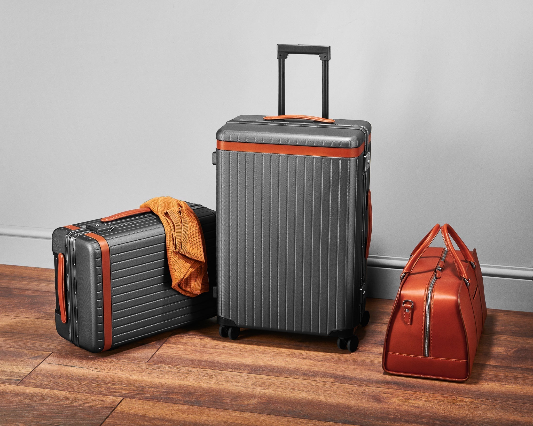 We offer two lightweight polycarbonate carry-on suitcases. Each streamlined travel case boasts an aluminium lock frame, effortlessly smooth Japanese spinner wheels and Italian leather detailing for a refined finish.